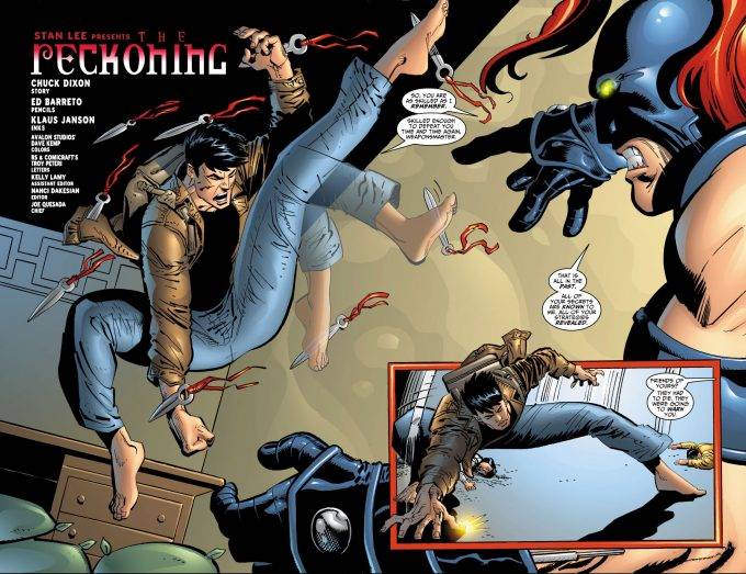 Nos vamos a Mayo de 2000, cuando sale la revista Marvel Knights, en la que debuta un nuevo equipo integrado por un puñado de «héroes urbanos»: Daredevil, Black Widow, Punisher, Dagger (de la afamada dupla Cloak & Dagger) y Shang-Chi, que nunca había formado parte de ningún equipo de superhéroes. El grueso de la acción se ambienta en Brooklyn, y los autores que llevan adelante la serie son el guionista Chuck Dixon (fanático de las artes marciales y los justicieros urbanos) y el recordado maestro uruguayo Eduardo Barreto. Esta es una serie corta, bastante legible, con el atractivo de que los 15 números mantienen el mismo equipo creativo, algo muy infrecuente en el mainstream de EEUU. Entre los nºs 4 y 7 hay una saga contra Zaran (uno de los villanos clásicos de la Era Moench), que es enviado a matar a Shang-Chi por su diabólico e innombrable padre. Por supuesto fracasará y regresará (al frente de un ejército de ninjas) entre los nºs 12 y 14 para la revancha. Acá ya Barreto nos va a mostrar claramente a Fu Manchu, aunque nadie lo llamará por su nombre, y lo más interesante, que es la confrontación directa entre padre e hijo, no va a llegar jamás. Nada de todo lo que pasa en Marvel Knights es imprescindible, pero las aventuras son llevaderas, están repletas de personajes copados (más tarde se suman Moon Knight, Luke Cage, Dr. Strange, Cloak…) y los dibujos son fabulosos.