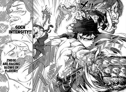 ¿Te aburrí? ¿No te interesa la cocina? ¿Preferís buscarte una pareja que cocine por vos porque no tenés idea ni de cómo prender una hornalla? Tranquilo, además de hacerte salivar, este manga parece más de pelea que de otra cosa. ¿Cocina? Sí, tiene mucha cocina, pero los Shokugeki (guerras de comida) que utilizan los personajes para imponer su voluntad sobre otro, desafiar, humillar o simplemente competir, tienen niveles épicos de tensión, dignos de un shonen. Yo vivo el semana a semana de Shokugeki como uno de mis mangas de peleas favoritos.