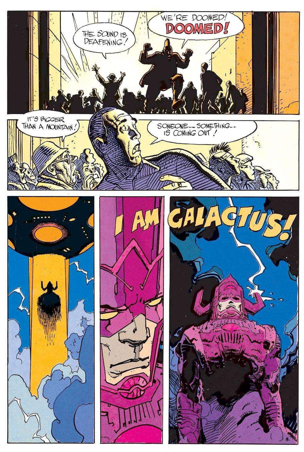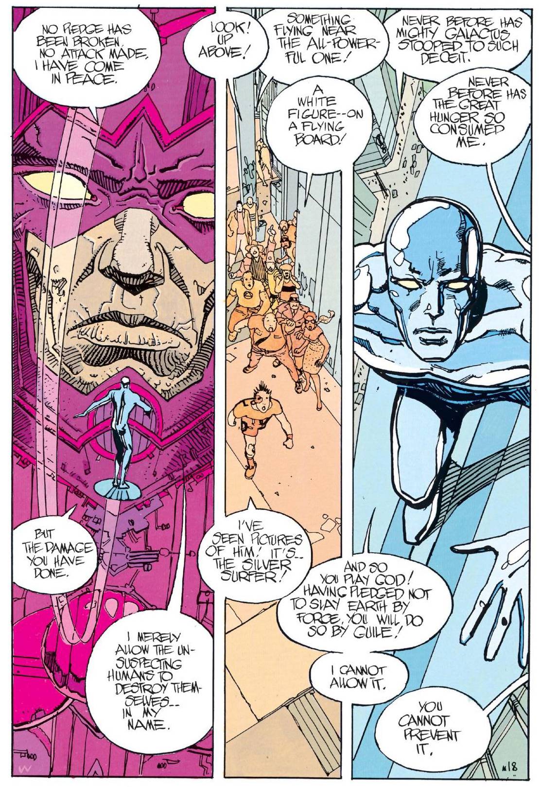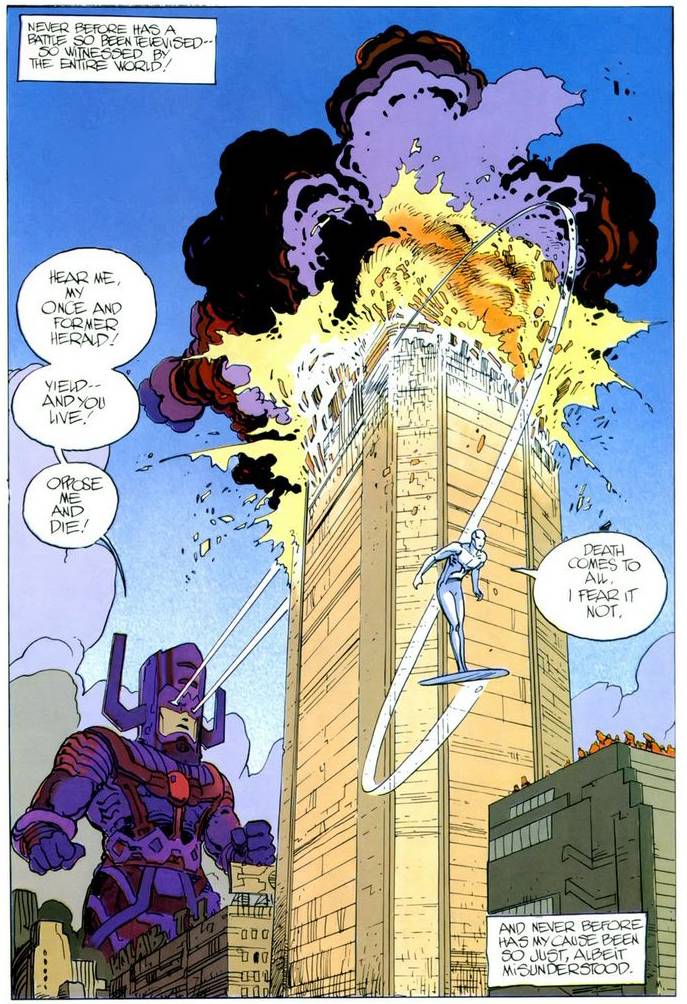 Galactus rápidamente se anuncia ante el mundo, sin ningún tipo de tapujos, como un dios. Esto genera una nueva corriente de fanatismo religioso en torno a su figura, que es aprovechada por Colton Candell, un evangelista venido a menos que rápidamente se posiciona frente al público como principal predicador de la palabra del dios cósmico. Será él quien se dedique a arengar a las masas y consolide una posición de poder incuestionable. El plan de Galactus es simple: no puede consumir al planeta porque está habitado, así que va a dejar que la humanidad se destruya a sí misma en un conflicto religioso, para luego proceder a darse su banquete cósmico, cuando no quede nadie a quién proteger. Esto, finalmente, saca a Silver Surfer de su letargo y se eleva una vez más hacia los cielos para enfrentar a su antiguo amo. A través de las figuras del Surfer y Galactus, Lee explora temas de fe y memoria. Un análisis cristiano podría decirnos que la violencia que suscita la fe en Galactus es lo que acaece cuando se cae en la idolatría: Galactus no es el verdadero Dios y por ende adorarlo solo puede traer consecuencias negativas. Un enfoque más cínico podría extenderlo a cualquier tipo de figura pseudo-mesiánica y es aplicable a todo episodio de la humanidad en el que se busque la salvación a través de una única figura, divina o divinizada.