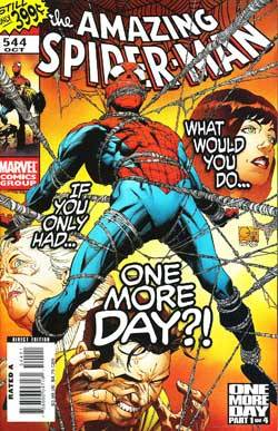 Así en Octubre del 2007 sale a la venta el Amazing 544, primer capítulo de One More Day. Guión de J. Michael Straczynski y dibujos de Joe Quesada, con tintas de Danny Miki. Peter está desesperado: su adorada tía May se muere y él no puede hacer nada para impedirdo. Peor, no tiene ni siquiera algo de dinero para que la pobre reciba digna atención médica. Superado por las circunstancias, acude a Tony Stark esperando algo de ayuda monetaria; mal que mal, parte de lo ocurrido es también responsabilidad de Iron Man. Aunque al principio se niega, habilita dos millones de dólares para la atención hospitalaria de May. Pero es una solución de plástico: la mujer se sigue muriendo. El pronóstico anuncia cielo algo nublado y desmejorando hacia la tarde.