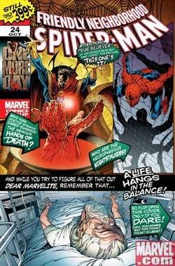 Unas semanas después, pero dentro del mismo mes, sale Friendly Neighbor 24, segundo capítulo de One More Day. Guión de JMS, dibujos de Quesada, tintas del Miki. Spider-Man acude al Dr. Strange por algo de “ayuda-del-más-allá”. En realidad, y gracias a un hechizo, Spidey pide ayuda a Mr Fantástico, al Dr Doom, a Morbius, al Dock Ock, a Pantera Negra, a Hank McCoy (todo esto en una página) y siempre vuelve con la misma respuesta: NO. La motivación de Peter se vuelve clara: él no quiere sentirse responsable por la muerte de su tía. En una de las líneas de diálogo del último episodio dirá: si esto fuera un caso de causas naturales, un ataque al corazón, edad avanzada, eso sería una cosa […] pero eso no fue lo que ocurrió. Ella recibió una bala dirigida a mí. Este lento episodio termina con una nena de diez años, pelirroja, que afirma poder salvar a May. Nublado y desmejorando, probabilidades de lluvia.