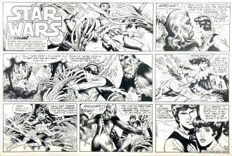 En 1978, Archie Goodwin y Al Williamson propusieron una adaptación en tiras de la película original, pero tras 12 planchas iniciales, el equipo dejó de tener tiempo disponible y el proyecto quedó trunco. Al año siguiente, Russ Manning, con la experiencia de su Tarzán en tiras, fue contratado como autor integral para producir una tira diaria y otra dominical, las cuales originalmente contaban historias separadas, y que según declaró el autor, las iba inventando sobre la marcha. Tras seis meses de entregas, Manning comenzó a dibujar guiones ajenos y las tiras que se publicaban comenzaron a tener una narración unificada. Todas las historias de las tiras fueron de concepción original y tuvieron lugar entre los sucesos de la primera peli y “Empire Strikes Back” con la excepción de Han Solo At Star’s End.