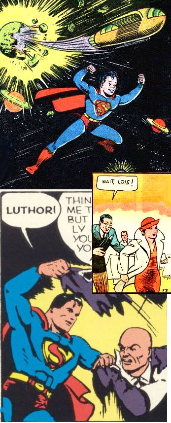 En sus primeras aventuras, Superman trepaba a los edificios, por lo general para atrapar a mafiosos cualunques que en muy pocas ocasiones representaban un peligro real para el héroe. La ausencia de grandes enemigos era algo característico de esos primeros números. Los únicos villanos que sobrevivieron a esa época fueron Mr. Mzyzptlk (1944), Ultra-Humanite (1939), el Juguetero (1943) y, como no podía ser de otra manera, Lex Luthor (1940), que era un científico ambicioso y no el poderoso magnate que hoy conocemos. El conflicto recurrente en esta primera época, y que para Siegel era un verdadero imán de lectores, eran los constantes intentos de Lois Lane por descubrir la verdadera identidad del superhéroe.