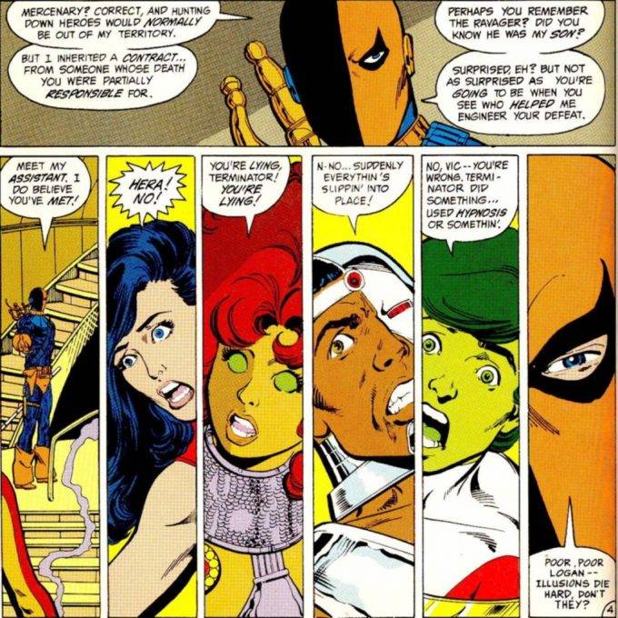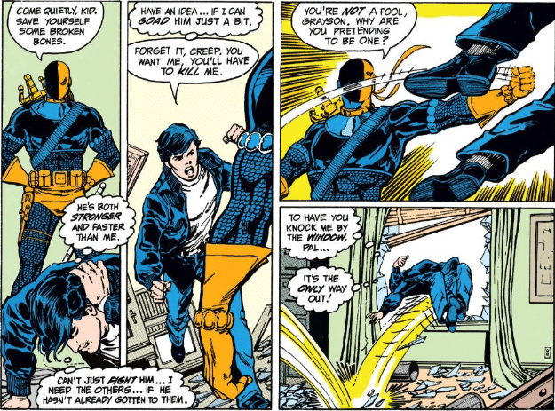 El nº 44 está más que nada centrado en la historia de Slade Wilson, de su relación con su esposa y con Wintergreen, sus años en el ejército, el experimento que le dio poderes y cómo se transformó en un mercenario. Pero también es el debut de la nueva identidad superheroica de Dick. Así es, señoras y señores, en este episodio hace su debut Nightwing y como si fuera poco, también lo hace Jericho, ya que el hijo de Terminator decide acompañar a Dick para detener a su padre.