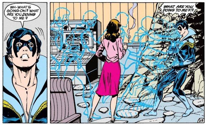 Pero no conformes con patear el tablero de semejante manera, la saga iba además a servir de momento clave para dos cosas más. La primera era presentar la nueva identidad superheroica de Dick Grayson, cosa sobre la cual no me voy a explayar demasiado porque ya conté los entretelones de esto, cuando le tocó abandonar el traje de Robin. Y la segunda, la incorporación de un nuevo miembro al equipo, como reemplazo de Kid Flash, que había renunciado unos pocos números atrás.