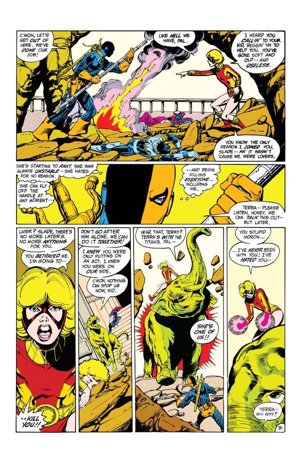 La idea sonaba perfecto, era algo que ya se había hecho muchísimas veces en los comics: aparecía un personaje que se hacía pasar por héroe, interactuaba con ellos, se infiltraba en el equipo para traicionarlos, pero al final siempre terminaba por redimirse, se daba vuelta y quedaba del lado de los héroes. ¡Eso acá no iba a pasar! La idea férrea de ambos autores era que Terra estaba condenada a morir sin redención alguna, era una autentica psicópata y eso no iba a cambiar, eso era lo revolucionario del concepto: agarrar un tropo remanido y llevarlo donde nadie lo había hecho antes, y como si fuera poco con un piba de 15 años, en un comic muy centrado en las relaciones interpersonales. Una verdadera patada al hígado para los lectores.