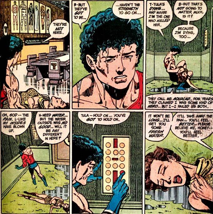 Vayamos a lo que Wolfman hace bien en este número, que no son pocas cosas. La primera y más relevante, incluso en algún punto hasta poco habitual, es que se banca un especial de 40 páginas, sin que aparezca un sólo villano ni se tire una sóla piña. Obviamente esto es todo mérito de la importantísima caracterización de personajes que el guionista desarrolló desde el principio de la serie. Eso le permite escribir un episodio de esta características sin que uno se aburra en lo más mínimo. Por ahí peca un poco de melodramático, pero se lo perdonamos, porque tampoco es fácil escribir este tipo de historias sin caer un poquito en eso.