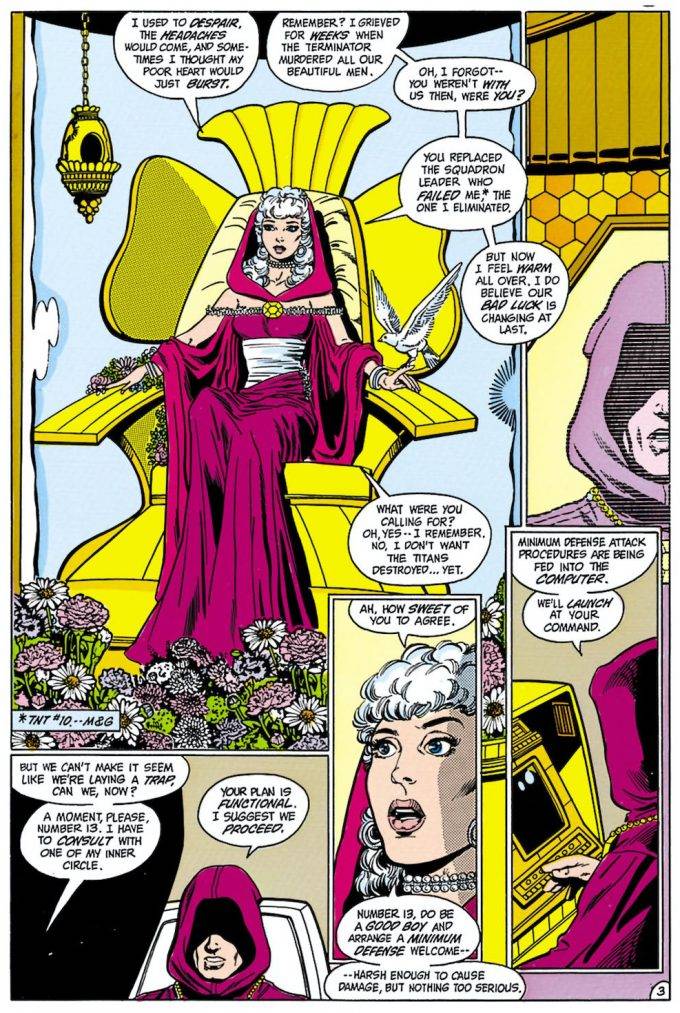 Con respecto al argumento, que va a continuar en los dos siguientes episodios, viene a acabar de una vez por todas con la amenaza de HIVE, un plot que había servido más para meter a Deathstroke en la historia que otra cosa. Y con esa línea resuelta, no tenía demasiada utilidad en la serie, al punto de que deja alguno cabos sueltos y una idea muy pelotuda: HIVE se ensaña con los Titans, porque eran más fácil de derrotar que la Justice League, una motivación muy similar a lo de los Fearsome Five. Incluso todo el plot de estos números que gira en torno a una supuesta invasión a Atlantis que jamás llega a concretarse, tampoco queda del todo clara, ya que el plan parece ser envenenar los océanos y no se termina de entender qué pito toca la ciudad sumergida en todo eso. El arco en sí no es horrible: Wolfman aprovecha la falta de Cyborg y Changeling para usar a Aqualad y Aquagirl, nos muestra una explosión de los poderes de Raven, que están cada día mas desbocados y muestran su peor cara, avanzan un poco en el desarrollo de Jericho como miembro del equipo y hasta vuelve Wally por un rato, a ver por qué nadie le dijo que Tara había muerto.