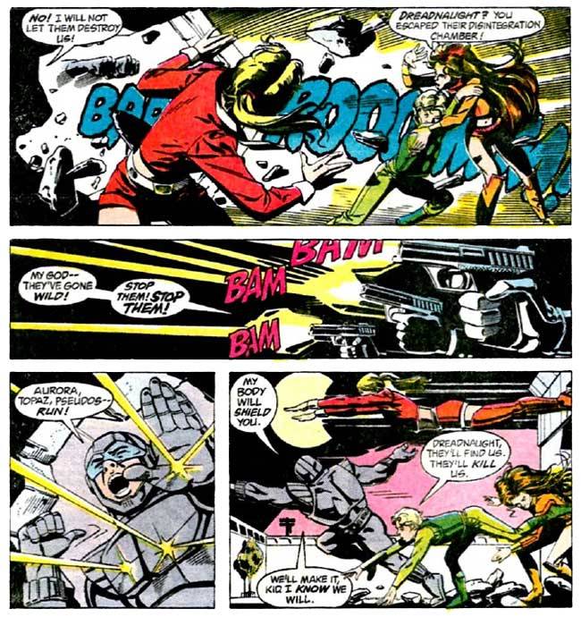 Pero no nos adelantemos: recién estamos en Agosto de 1984, cuando el nº45 sale a las calles, al mismo tiempo que el nº1 de la nueva serie, apodada «la Baxter» por el tipo de papel en el que se imprimía. Para ser ordenados, vamos a cerrar primero el repaso por esta serie, para después meternos de lleno con la otra, ya que cronológicamente parecerían estar ubicadas más o menos en ese orden, sin indicios de que transcurran al mismo tiempo. Como ya mencioné, y producto del exceso de trabajo, estos números tienen sólo bocetos y plantado de Perez, terminados por Mike DeCarlo que hace un laburo correcto, pero que no terminó de convencer al que fuera dibujante titular, quien manifestó: “La verdad que lo que me molestó fue sobre todo el dibujo. Fue mi culpa, por haber entregado sólo bocetos, a Mike DeCarlo, que no conocía a los personajes y le agarró la mano a las caras y a cómo dibujarlas para que funcionen. Entonces todos se ven muy parecidos; y con el estilo de entintado de Mike, los personajes se ven muy estáticos. Incluso cuando yo le di el lápiz completo, su trabajo se veía un poco duro, y cuando trabajó sobre bocetos esto se notó más. Y en cuanto a la trama, a pesar de la construcción previa, pasó todo muy rápido. Me parece que si se pensaba más, podría haber sido mejor».