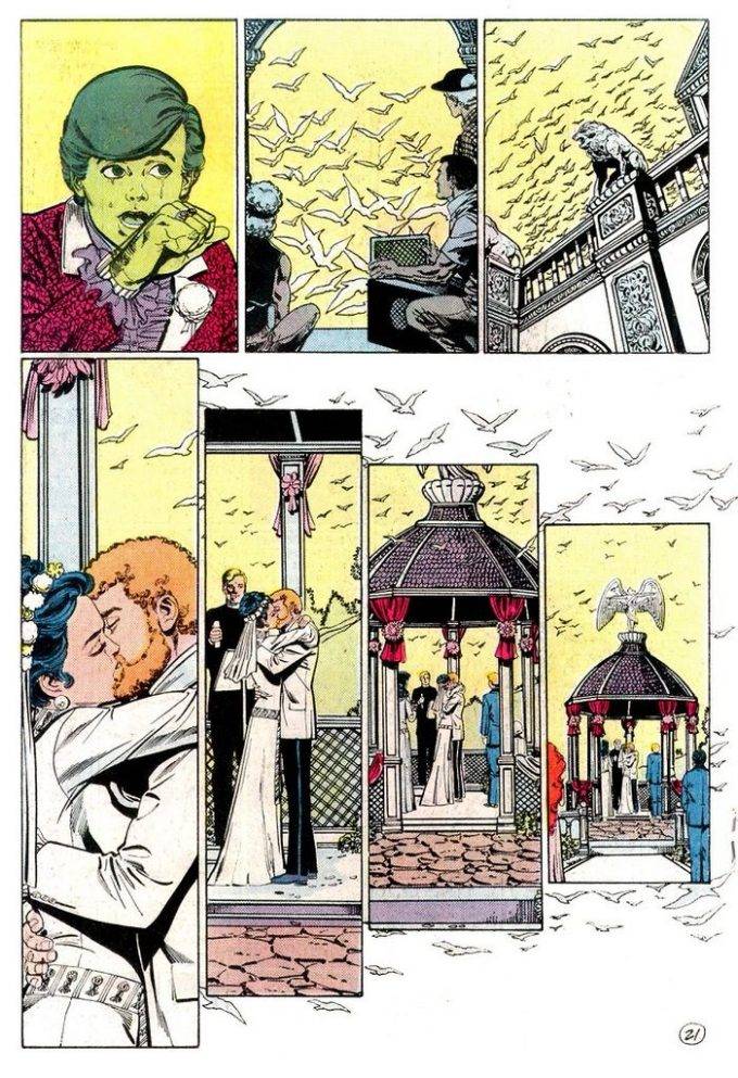 Y -con esto cierro- lo que hace Wolfman con estos personajes es increíble. En pocas viñetas en la mayoría de los casos, en unos sencillos diálogos casuales, logra dotar a un montón de personajes medio pelo, de una carnadura que jamás tuvieron y eleva su status al de miembros del equipo relevantes, a pesar de que hacía 10 años que no aparecían en una revista. Golden Eagle, Duela Dent, Kathy Kane, Mal Duncan e incluso Sharon, la compañera de cuarto de Donna en la serie clásica, están como invitados a la boda, tienen escenas con otros personajes y nos da la impresión de que jamás se fueron y que nos importan sus vidas y lo que les pasa. Por unos pocos segundos, queremos que Garth y Tula digan que sí a reformar los Titans West, o lamentamos el retiro de Mal y Karen por haberse casado, o nos intriga ver que Duela está tan vieja y saber si es o no es hija de Two-Face. Y todo esto es mérito 100% del guionista, que sabe cómo tejer las relaciones de los personajes para que le demos pelota y nos importe un montón de gente que hasta hace cinco minutos ni sabíamos que existían. Y después nos preguntamos por qué era el titulo más vendido… Porque producía esta magia, que es algo que no es tan fácil de encontrar regularmente en un comic de superhéroes.