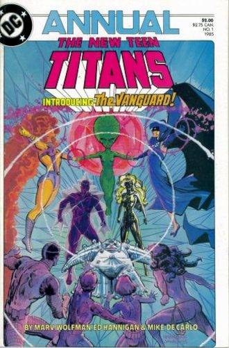 Quedó en el tintero el primer anual de la serie, una historia bastante intrascendente, en la que Marv Wolfman trata de introducir en el Universo DC un nuevo grupo de héroes intergalácticos, conocido como Vanguard. Publicado poco después de la salida del nº 12 de la serie, no queda muy claro dónde se ubica cronológicamente esta historia, ya que lo tenemos a Jericho en la Torre revisando los archivos del grupo sobre antiguas misiones y el cuartel de los Titans todavía está en reconstrucción en ese momento (pero podemos suponer que pasa un poco después ya que para el nº13 vuelven a utilizarlo). No conforme con esto, la aventura que se cuenta es todo un flashback que transcurre cuando Terra aún era miembro del equipo. La verdad es que no hay una justificación real de por qué la historia está ambientada en ese momento. No queda claro si Wolfman reciclaba un guion que tenía guardado en un cajón, o que por el momento tumultuoso que estaba pasando el equipo le pareció mejor que transcurriera en el pasado. Como sea, lo cierto es que la historia no aporta absolutamente nada y es todo una excusa para ver si pegan estos nuevos personajes y el guionista se consigue un currito extra, al punto tal que el especial cierra diciendo que si quieren leer más sobre Vanguard escriban a la dirección postal de las oficinas de aquel entonces de DC.
