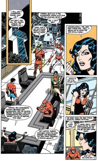 Pero regresemos al presente (o mejor dicho a aquel presente de 1986), con una portada maravillosa de George Pérez que reza: “Los Titans originales están de vuelta!” Wolfman se manda una venta de humo maravillosa. Como ya contamos, el equipo se encuentra totalmente desbandado y ante la llamada de Faraday -que pide una changuita para el gobierno- a Donna no le queda otra que formar un grupo de emergencia con sus más antiguos compañeros.