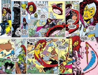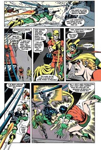 Pero -como siempre- el punto fuerte de la historia, no está en lo que sucede, sino en la interacción entre los personajes, y acá es donde el guionista se hace un verdadero festín. Tres de los nuevos miembros están lidiando con haber perdido un ser querido en la Crisis: Wally a Barry de quien asumió su rol como Flash, Hank a Don, lo que lo vuelve completamente psicótico y descontrolado al faltarle su mejor mitad, y Garth a Tula, lo que lo convierte en un despojo que anda llorando por los rincones. Además tenemos el conflicto sentimental entre Roy y Chesire, y la revelación de que tuvieron una hija durante lo que duró su turbulento romance. Y para cerrar, está el conflicto de Donna por la disolución del equipo a su mando, sus problemas personales con Terry, y la necesidad de proyectar en Robin un montón de responsabilidades, sin darse cuenta de que es Jason el que está bajo la máscara y no Dick, lo que también genera un conflicto, porque el nuevo Joven Maravilla no tiene ni en pedo la experiencia de su predecesor.