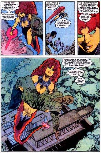 Eso le gana el odio de sus seguidores, pero es la propia mujer de Mandutu la que duda de todo lo que el gobierno diga y decide confiar en Kory. Así es como la investigación los hace descubrir que en realidad le habían disparado en la cabeza antes de la llegada de Starfire, y todo era parte de un plan para que los negros se levantaran en armas buscando venganza y poder exterminarlos. Pero al final del día, optan por la manifestación pacífica, lo que deja en offside a las fuerzas de seguridad, que -en una movida un poco tibia del autor- confiesan que actuaron de manera independiente guiadas por un capitán mega-racista, lo que deslinda al gobierno de la responsabilidad de los hechos. La verdad que es un buen guion de Wolfman, en una época un tanto deslucida y que sirve para darle un giro a Starfire, que finalmente reconoce que la violencia exagerada no conduce a nada y decide templar su carácter. Al final tenían razón Dick y Donna al cuestionarle la forma de resolver los problemas. De esta manera, cuando regrese a la serie regular dentro de un par de números, veremos una nueva Kory, un tanto más moderada con su temperamento belicoso.
