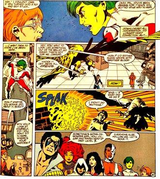 El 47 es otro número fuera de lugar, a pesar de que esta vez si está escrito por Wolfman y el dibujante es Kelley Jones. Se ve que Barreto no llegó con los tiempos o algo así, y sacaron este episodio de la galera, que yo estimo debería estar pensado como el nº49. Ya de entrada, al final del numero anterior se anuncia para el próximo el regreso de Red Star, cosa que va a pasar en el 48, donde además la acción transcurre en San Francisco, donde siguen los Titans, ya que todavía no volvieron a NY. Pero en este episodio están de vuelta en su cuartel de la torre, lo cual hace muchísimo ruido, sobre todo porque esta escrito por Wolfman, que es bastante cuidadoso con ese tema. Pero como digo, alcanza con ver cómo empieza el próximo episodio para notar que éste no estaba pensado para ser publicado acá. No voy a perder tiempo en lo que pasa porque es muy peloudo: alguien arregla la computadora de la Torre, los Titans se van de joda, Danny se queda solo, se pone a leer un libro que está escribiendo Jericho sobre los miembros del equipo, y con esa excusa nos vuelven a contar el origen de casi todos. La gracia son dos: una es que cuando Danny llega al final descubre que no hay nada escrito sobre Donna, y ella confiesa que no tiene recuerdos de su pasado más allá de ser rescatada de un incendio y tiempo después tener su primer aventura con los Titans, y la segunda es que el técnico resultó ser Wildebeest disfrazado. Al entrar a la computadora, tuvo acceso a toda esta información, que era lo que había tratado de conseguir antes sin éxito de la boca de Mother Mayhem. ¡Una paparruchada cósmica!