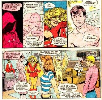 Esta también es considerada la primera aparición post-Crisis, de Golden Eagle y Flamebird. El primero simplemente con un rediseño completo de su traje, que ya no aparece un afano al de Hawkman y Flamebird, la nueva versión de la Batgirl original, ahora rebautizada como Bette Kane (en lugar de Betty) y también con un rediseño de su traje mas acorde. Otra cosa que hace Perez es solucionar el tema de las varias identidades secretas de Mal Duncan. Acá las fusiona a todas en la de Herald, y deja fuera de continuidad su paso por las de Guardian y Hornblower, que habían durado menos que un pedo en una canasta. Además, su “cuerno de Gabriel” que utiliza como arma, va a ser fundamental en la resolución de esta historia.