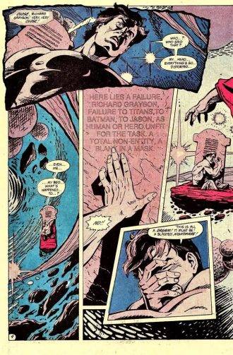 La forma que elige George Perez para contarnos esta historia es rara. En lugar de hacer una recapitulación del origen del equipo, hace una historia totalmente inserta en la continuidad de la serie, en la que Dick, todavía atormentado por la muerte de Jason Todd, ve sus sueños invadidos por un villano que le quiere mostrar cómo siempre fue un fracaso como líder de los Titans. Con esto como excusa, Dick va ir reviviendo momentos fundamentales de la historia del grupo, desde su primer enfrentamiento con Mr. Twister, hasta prácticamente la actualidad de la serie. Lo más interesante es el esfuerzo que pone el guionista en comprimir los tiempos, y tratar de darle sentido a cosas que post-Crisis no lo tienen, o que jamás lo tuvieron producto de su época. Hagamos un breve repaso por lo más destacable.