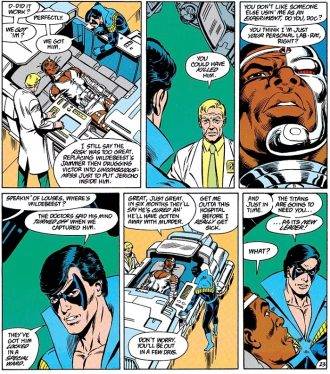 Los siguientes tres episodios van a traer nuevamente a Wildebeest, el primero con la dupla de Perez y McLeod en el dibujo, a la que a partir del nº 58 se le van a sumar los lápices de Tom Grummet, porque Perez se va a encargar solo de la puesta en página. La parte argumental sigue a cargo de los creadores de la serie, con diálogos de Wolfman. La historia está bastante estirada al pedo. Los Titans son atacados por el villano y cuando consiguen capturarlo, resulta que bajo la máscara se encuentra Cyborg, que estaba desaparecido. Así es como se enteran que en la última reparación que le hicieron, algún científico le metió algo en su programación para controlarlo y no saben en quién pueden confiar dentro de STAR Labs. Esto pone en riesgo la vida de Vic, que tiene que ser intervenido, pero los Titans están llenos de dudas por todo lo sucedido, al tiempo que tratan de rastrear al verdadero Wildebeest. Al final, como era de esperar, Cyborg se salva, pero descubren que STAR tenía acceso a sus memorias y que era de donde el villano obtenía la información. Por otro lado, cuando el villano es capturado, cae en una especie de catatonia y queda hospitalizado en un psiquiátrico, tras una breve pelea con Jericho, que se encontraba dentro del cuerpo de Vic. A diferencia de otras veces en que todo parece apurado, acá se toman demasiado tiempo para contar algo que no lo justificaba.