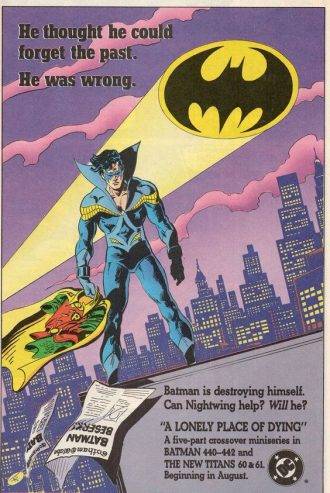 “A Lonely Place of Dying” arranca con Batman descuidado y violento. La muerte de Jason realmente lo afectó y sus enfrentamientos con enemigos son cada vez más brutales cada vez regesa más herido después de cada patrulla nocturna. Alfred se lo hace notar, mientras nos enteramos que hay alguien que lo está siguiendo y mientras registra lo que le sucede. La figura misteriosa se va a New York a buscar a Dick, pero se entera que ya no está con los Titans, mientras que en Gotham Batman descubre que detrás de los robos y asesinatos que está investigando se encuentra Two-Face. Por su parte Dick, regresa al circo donde laburaba de pibe con sus padres y es ahí donde Tim se va a dar a conocer y le va a explicar al antiguo Robin por qué Batman lo necesita. Mientras tanto, el episodio resuelve un pequeño misterio dentro del circo y los Titans apenas figuran un par de páginas al principio, para dejar la mayoría de este nº 60 en manos de Dick.