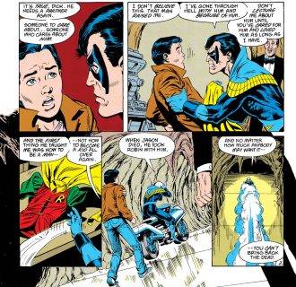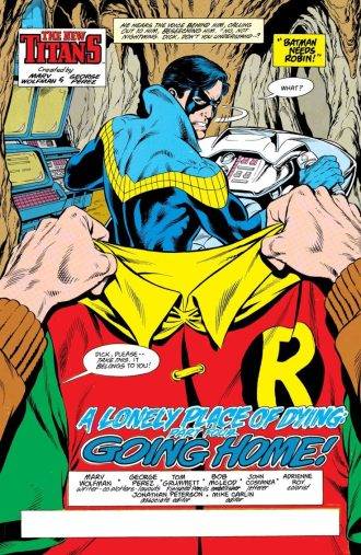 Claramente la respuesta de la editorial era no, y por eso llamaron a la persona que llevaba años a cargo de Dick Grayson para que creara a un nuevo personaje que estuviera a la altura de las circunstancias, y que por sobre todo tuviera el aval de quien por casi 50 años había llevado los pantalones cortos. De esta manera se decidió que la historia fuera un crossover y transcurriera en tres números de Batman y dos de los Titans. Con guiones de Wolfman, en colaboración con su viejo amigo George Perez, que también hacia el plantado de los números de Titans, y se hizo cargo de las cinco portadas. El equipo también incluía a Tom Grummett y Bob McLeod laburando con Perez, mientras que los numeros de Batman tenían lápices de Aparo con tintas de Mike deCarlo, lo que asegura que al menos a nivel visual la saga no defrauda en ningún momento.