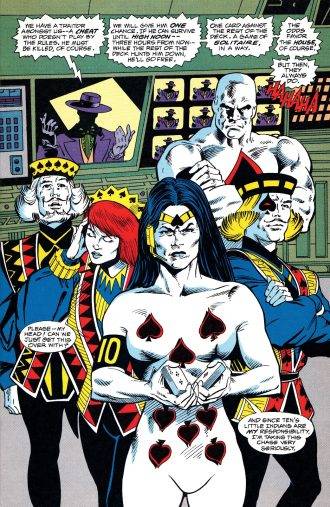 En esta encarnación tenemos por primera vez un Ace humano, en lugar del robot clásico de sus apariciones previas. King, por su parte se descubre como metahumano tras los eventos de Invasión, y no puede morir. Mientras queda tuerto y le reemplazan el ojo por un rayo láser. Queen y Ten, por su parte no sufren modificaciones, salvo porque Ten, en un tiempo que estuvo operando en solitario, entrenó a un grupo de pibes de la calle, para que sean sus esbirros y es entre estos pibes que se cuela Danny Chase. El principal atractivo de estos numeritos es la interacción entre los miembros de la Royal Flush, cómo Gambler los manipula y el fracaso del plan de Danny. Los Titans tienen apenas una o dos secuencias cortas, que no involucren estar peleando contra los villanos, y se siente como una bocanada de aire fresco, el cambio de foco del arquito. Obviamente al final del día, los villanos fracasan, los héroes triunfan y Danny Chase se retira con el equino fatigado, pero promete volver para demostrarle a los Titanes que no debieron rajarlo del equipo.