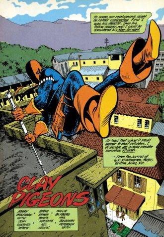 Hay un líder político (muy parecido a Mandela) que fue metido en cana por el gobierno, pero el nuevo gobierno para evitar más levantamientos, lo pone en libertad y planea una alianza, que traiga paz en el país, y ponga fin al enfrentamiento entre el gobierno y los revolucionarios. Deathstroke es una pieza fundamental en la articulación de la liberación de Jorge Zaxtro y cuando se está por ir, le dicen que la vida del líder del pueblo está en riesgo y tiene que protegerlo porque su muerte va a generar otra vez un millón de quilombos en el país. La verdad que esta bastante bien el numerito, y marca bastante el ritmo de lo que puede llegar a ser la serie del mercenario. Acá no hay ni buenos ni malos, todo se mueve en una línea muy gris y las conspiraciones no siempre se originan donde uno lo sospecha. Un lindo episodio, pero que desentona bastante dentro de la serie, salvo por la idea de testear si prendía con los lectores… Algo que claramente sucedió, porque al año siguiente el mismo equipo creativo lanzaría el título en solitario del personaje.
