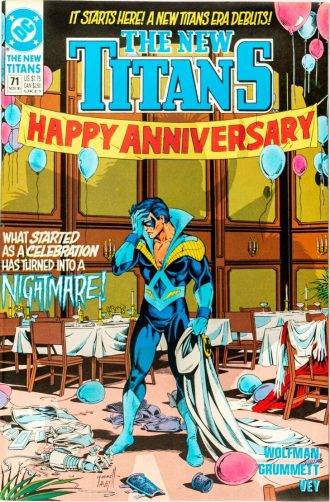 Ya en la serie de los New Titans, el nº 71 (Nov. 1990) marca el décimo aniversario de la colección y lo iban a usar como excusa para ser el puntapié inicial de una nueva etapa. La realidad es que la serie estaba en la cuerda floja, las ventas venían en picada desde hacía un tiempo y la serie necesitaba renovarse o morir. Y el encargado de darle aire nuevo al título fue el coordinador Jonathan Peterson, que venía de ser el asistente de Mike Carlin, hasta que este dio un paso al costado en la serie para abocarse de lleno a los títulos de Superman, que cada día le demandaban más tiempo.