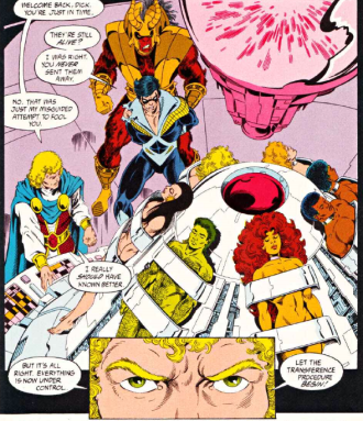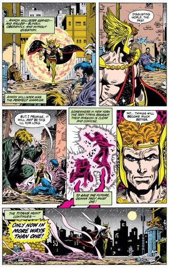 Marv Wolfman hace algo que pasa bastante poco a lo largo de esta macrosaga, y es incorporar la historia en el canon de la serie, si bien lo que vemos es solo un futuro posible, es de allí que sale el nuevo equipo y sirve para aclarar bastantes cosas sobre el mismo. El gran problema que enfrenta el guionista es que al caerle en el medio de la “Hunt” tiene que hacer malabares para hacerse cargo de lo que pasa ahí. El Annual nos presenta un futuro en el que todo parece indicar que los Beest ganaron la contienda y la mayoría de los Titanes desaparecieron, dejando a Dick solo obsesionado con encontrarlos. No está mal la premisa, pero el propio Waverider se da cuenta de que es un futuro sin mucho futuro (valga la redundancia), ya que el mismo Wolfman sabe cómo va a terminar la saga y la idea de los Titans desaparecidos por un década es insostenible. Por algún motivo que también queda poco claro, Dick cree que la clave para encontrar a sus compañeros desaparecidos está en manos de Lord Chaos, un tirano que busca dominar al mundo y para eso tiene a la población controlada con drogas que les nublan la capacidad de pensar libremente. También nos vamos a enterar que Chaos logró esto con ayuda de unos alienígenas que le facilitaron los medios, a cambio de que los ayudara a tomar control de su planeta. Y como si fuera poco, el villano revela que es… hijo de Donna Troy. Al final del especial, después de que los Titans se enfrenten algunas veces contra Lord Chaos y sus secuaces, nos enteramos que la nueva misión del equipo es viajar al pasado para eliminar a su madre y evitar de esta manera que el tirano exista.
