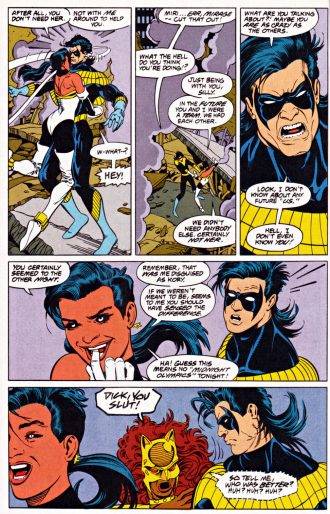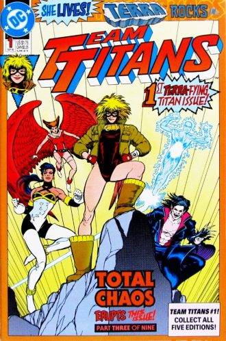 Llegamos así a este primer crossover, que arranca en Septiembre de 1992, conel nº14 de Deathstroke, para continuar en nº 90 de New Titans, que dará pasó al nº1 de Team Titans , y así se alternaran las colecciones por tres meses o nueve entregas (tres de cada colección). Y la verdad sea dicha, esta decisión es pésima por mas de un motivo. El más importante es arrancar un título nuevo en un crossover: ¡una forma espantosa de atraer nuevos lectores! Supongo que sirve para obligar a los lectores de años de Titans a sumarse a la nueva revista, pero obliga a cualquier otro a comprar títulos que por ahí le chupan un huevo para entender qué poronga pasa en este título que acaba de empezar. Igual, capaz estoy equivocado, porque el nº 1 de Team Titans vendió casi un millón de ejemplares con el curro ese de las cinco historias alternativas y le fue muy bien. Pero para mí es un delirio lo que hicieron, y tuvieron suerte de pedo.