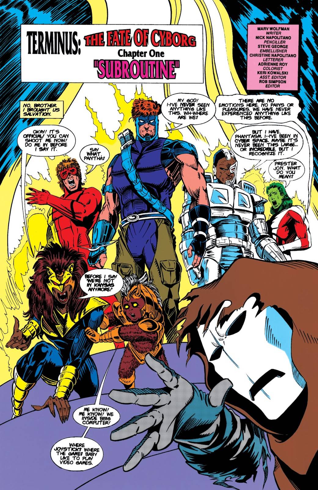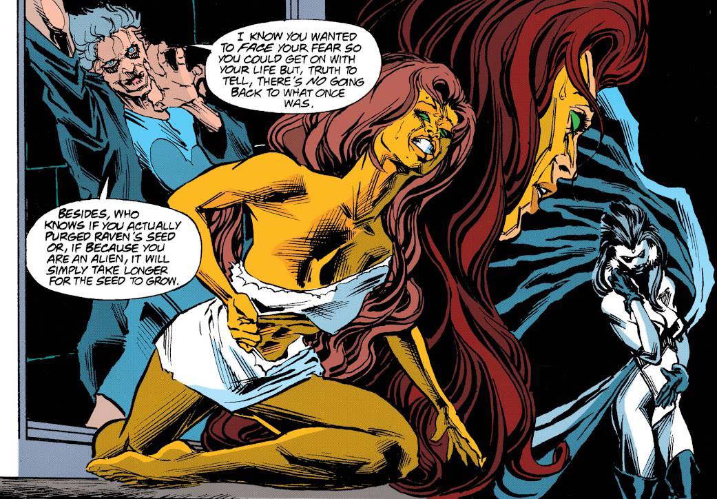 Lo más triste es que el guion de Marv Wolfman no es mucho mejor: con este arco podemos decir que arranca oficialmente el principio del fin. Si bien, es algo que se venía cocinando hace tiempo y después del número 100 se puso en completo funcionamiento, es acá donde el plan de Wolfman se vuelve manifiesto e irreversible. La serie necesita un cambio total, y para eso hace falta limpiar a todo el equipo original. Sí, aquel que nos dio tantas alegrías desde 1980, debe desaparecer por completo y de esta manera el proceso que arrancó con Donna tras Total Chaos, se va a extender rápidamente a partir de este arco a Cybrog, Starfire, Changeling, Nightwing e incluso Raven (que llevaba ya mucho tiempo fuera del título) de manera más o menos definitiva para que -con la llegada del número 0- la serie tome otro rumbo, tenga otra formación, etc, etc.