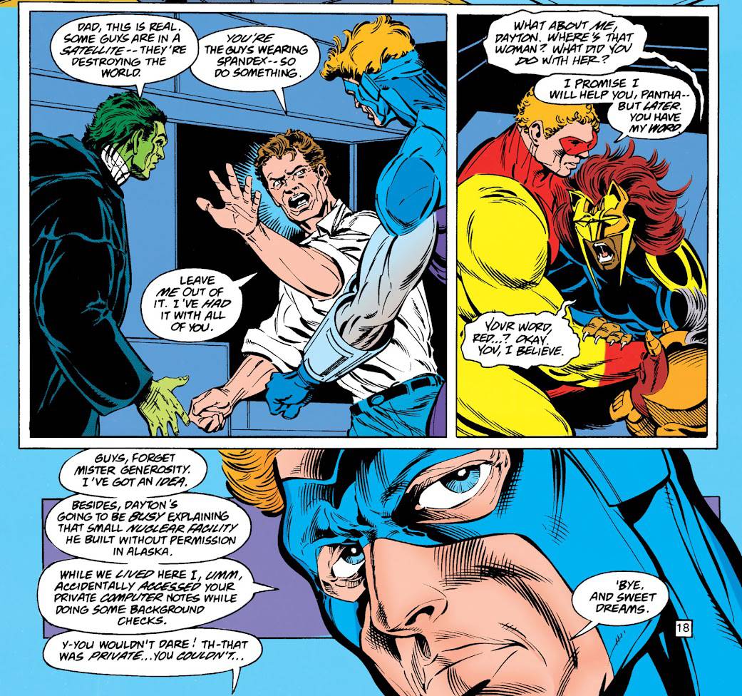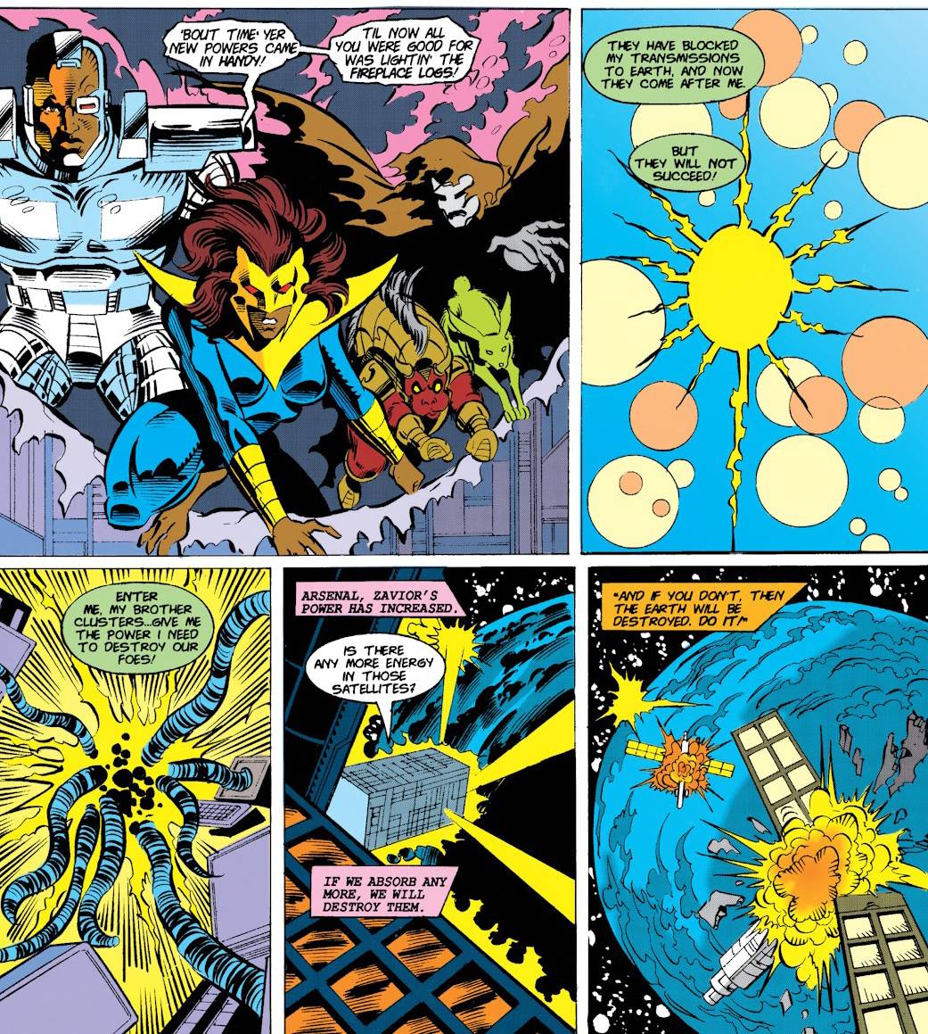 La verdad que no hacían falta cuatro números para contar solamente esto. El ataque de Technis a la Tierra es patético, las infinitas secuencias con Arsenal encerrado en una caja en el espacio persiguiendo al planeta también están al pedo, y asi podría seguir enumerando todo lo que está mal, pero no vale la pena. Una cosa que me olvidé: hice tanto hincapié en el dibujo de Napolitano, que no mencioné que solo ilustra dos de los episodios, mientras que los otros están en manos de Mark Tenney... que no es mucho mejor para ser sincero. Olvidemos todo esto, y demos vuelta la página.