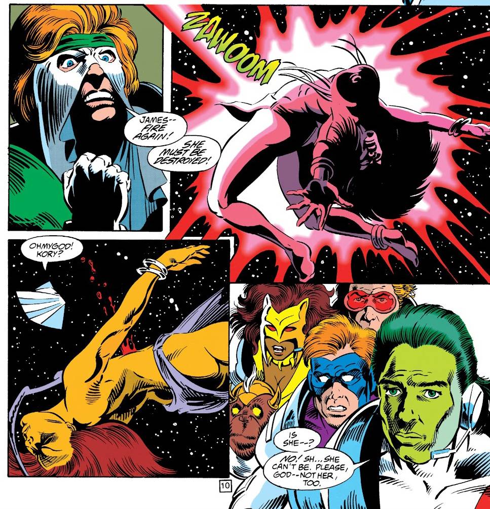 El 112, es uno de esos números que antes Marv Wolfman hacía tan bien, basado en la interacción entre personajes, pero que en esta etapa de la serie ya no le importan a nadie. El dibujo está a cargo de Rick Mays, que sin ser bueno, trae un respiro entre tanto dibujante horrible... y otro número sin Jaaska es algo que siempre se agradece. Lo que pasa se puede resumir en que, por falta de espacio en la nave, solo regresa a la tierra Arsenal con los prisioneros, mientras el resto del equipo se queda en el satélite, y tiene que lidiar con Kory que niega conocerlos. La situación escala, hay piñas, y todo termina cuando Red Star le da un beso a la princesa de Tamaran para hacerle recuperar sus recuerdos, ya que si en el nº 2 funciono besar a Dick para aprender inglés, ¿por qué no iba a funcionar ahora? No veo fallas en su lógica, sobre todo si implica darle un beso a Kory. La cuestión es que en efecto funciona y recupera todos sus recuerdos.