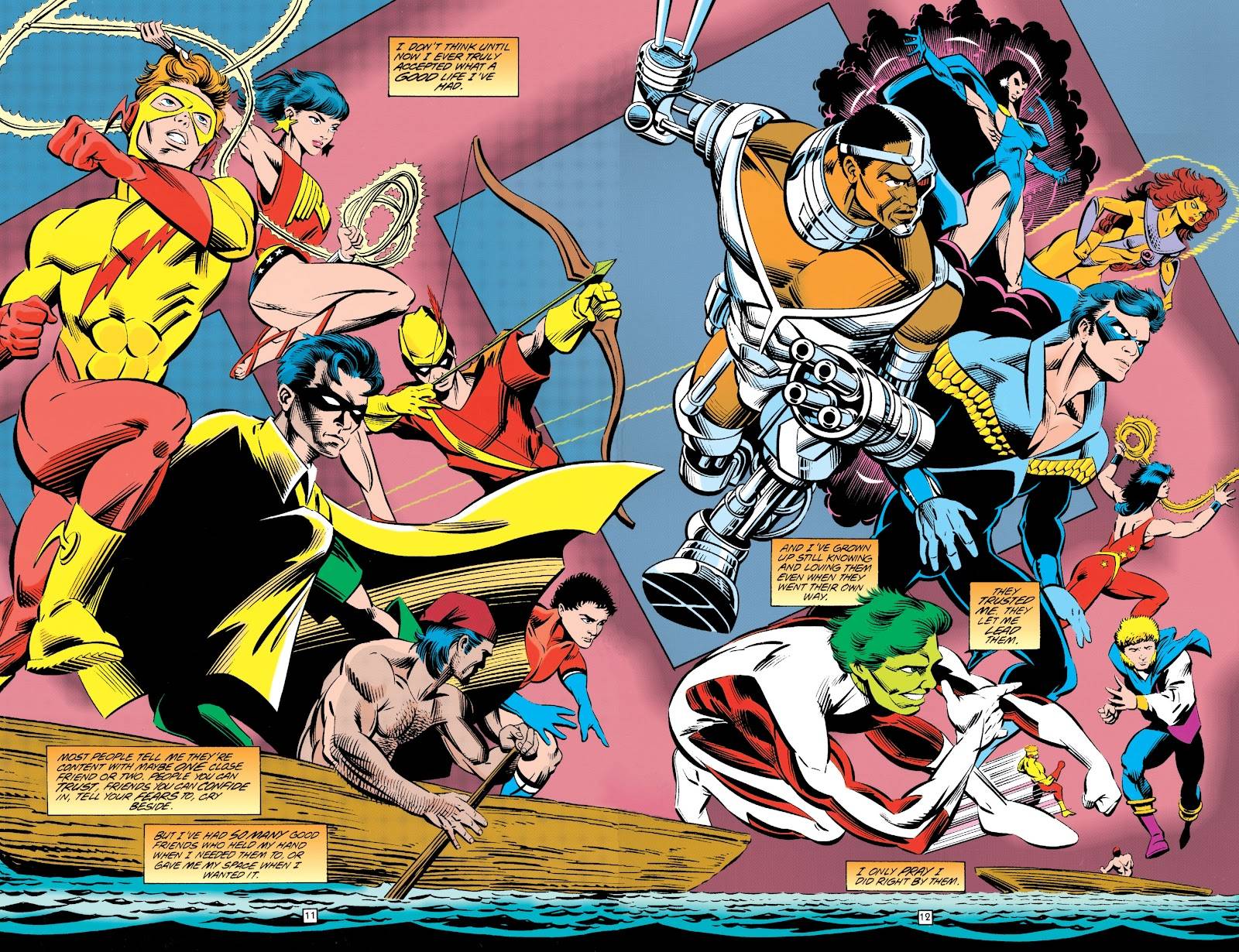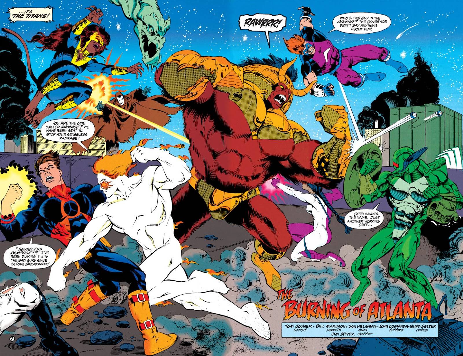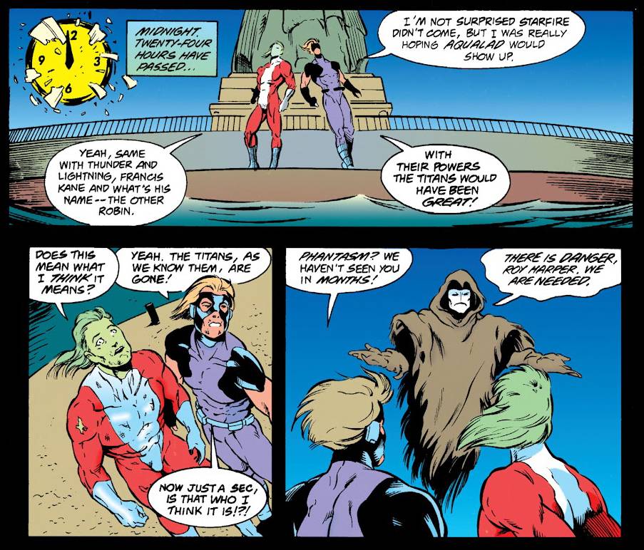 Ese número va ser la última aparición de la formación como venía hasta ese momento, y se nota que es algo que el guionista Tom Joyner ya tenía pensado antes de saber que iba a pasar con los Titanes. De todas maneras es un lindo guiño, ya que en el número siguiente Damage se va a unir al equipo. Pero, básicamente, Arsenal, Changeling, Pantha, Red Star, Baby Wildbeest y Phantasm, vuelven a reunirse para tratar de detener a Damage, a quien acusan de haber causado una explosión en Atlanta. La verdad es que es todo muy confuso, y por los diálogos de los personajes se intuye que el gobierno mando a los Titans a detenerlo (cosa que suena lógica con lo que venía pasando en los últimos números de la serie), pero se contradice con la escena en que Phantasm reclutan a Roy y Gar al final del 114. De todas, formas, mas allá de un tole-tole con un villano, y la confusión de si Damage es o no una amenaza, no pasa mucho más, y se nota que al final se retocaron algunos diálogos, para mencionar que es su ultima vez juntos y listo, buenas noches! Se viene el número 0 y ya nada va a ser lo mismo.
