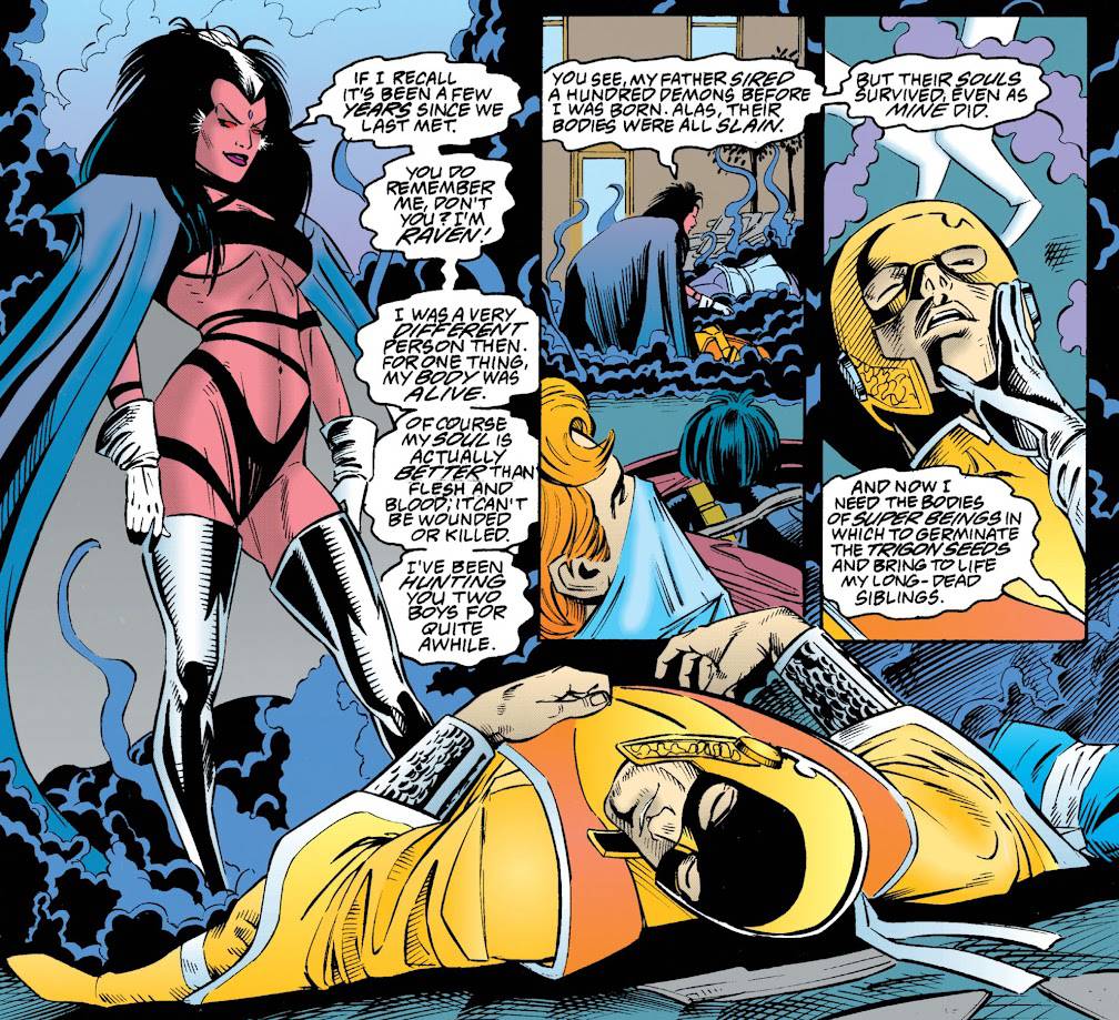 El 118 es una especie de episodio puente entre lo que venia pasando y el siguiente arco argumental que va a girar en torno a las semillas de Trigon. Lo más interesante es que el nivel de machaca baja muchísimo y el guionista se toma un rato para la interaccion entre los personajes, que tratan de acomodarse a su relación como equipo. De todo esto lo más interesante es la charla de Roy y Donna, donde esta le cuenta que Terry la está demandando por la tenencia de su hijo y termina cuando ella acepta volver al grupo. En paralelo a todo esto, como dije unas líneas más arriba, vemos cómo Raven toman el control de Thunder y Lightning, que se encuentran combatiendo a los hombre de Crimelord en San Francisco, y también se lleva a un personaje nuevo que estaba STAR Labs, tratando de comprender sus poderes. Gar, por su lado, se levanta a una minita en un boliche y se la entrega a Raven para que se alimente de su alma, en algunas de las secuencias más innecesarias del capítulo.