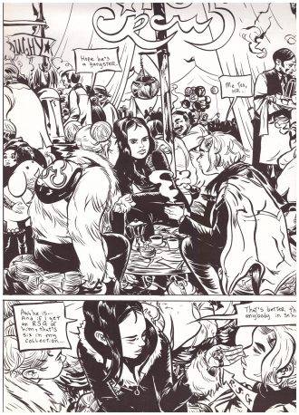 Zanjadas estas cuestiones conceptuales, vayamos a la antología en sí que, como quedó claro, es 100% ciencia ficción, como la Particle Dreams de Howarth reseñada previamente. Esta saga ambiciosa (“a surrealist mechanism” la define Pope) está protagonizada por HR Watson, una chica rebelde de 13 años que vive en un Marte colonizado del futuro, que tiene una vida medianamente normal, más allá de su padre inventor, que en cierta forma altera la forma de vivir que tienen ambos. A ella le acompaña un robot/ mayordomo llamado Augustus y el Super Mek, un guardaespalda creado en base al Try-Hydro-Bioxygen, también conocido como THB. Perdón si no se como traducir esto, pero básicamente es un compuesto químico realizado en la misma empresa que maneja papá Watson, que tiene que mudarse temporalmente a V-City. En algo está metido, porque su desaparición conlleva a que HR sea acosada por diversas criaturas tanto tecnológicas como bizarras (en el segundo número pelea contra un piano de cola Steinway con vida, no es joda) que buscan asediar al genio.
