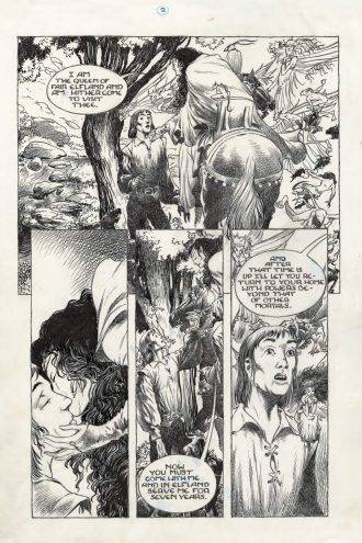 Es difícil reseñar una antología de este estilo, donde las historias cortas son muchas, variadas y además de no tener un hilo conductor más allá de su origen, justamente esto es algo que le interesa a cierta “minoría”. Ahora, si sos de comprar comics por los dibujos, esto tendría que interesarte y mucho. Vess a blanco y negro es un placer, es un artista barroco en estado de gracia, que disfruta por completo de dibujar las historias que más ama protagonizadas por elfos, criaturas demoníacas, bardos… el artista está por completo en su salsa, capaz sin innovar desde lo narrativo: muchas puestas en páginas son raras, con los diálogos fuera de la viñeta. El cuarto número incluye la historia corta Tam-Lin que está en prosa y es acompañada por ilustraciones apabullantes, dignas de un ganador del Premio Hugo (Por esta revista, Vess se ganó un Eisner en 1996).