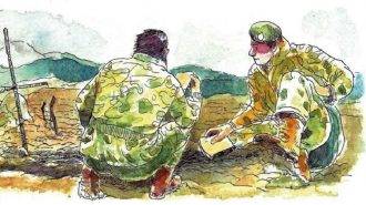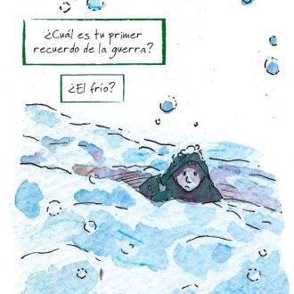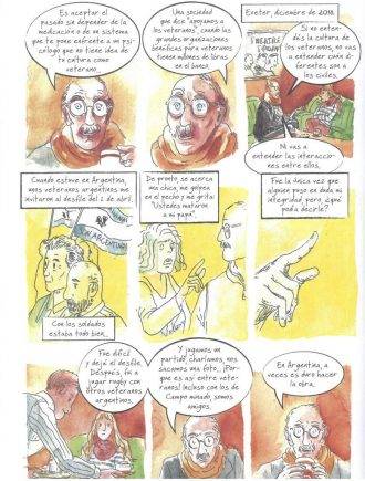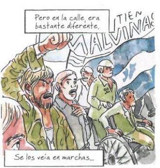 Arranca el Capítulo 1 “Inmortal”, situado espacialmente en Buenos Aires y temporalmente en el año 2017, y vemos excavaciones de lo que parecen fosas comunes que poco a poco empiezan a introducirnos en una de las etapas más oscuras de la historia de nuestro país: la última dictadura cívico-militar. De repente, las viñetas nos hacen emigrar hacia el conflicto económico con los ingleses y los desencuentros políticos con Chile, para desembarcar en el conflicto por las Islas del Atlántico Sur…y termina por sumergirnos de lleno en la Guerra de Malvinas. En ese camino guiado hacia el corazón de la temática que abordará la historia, Lauri Fernández se hace presente explícitamente en las viñetas para conversar con un excombatiente de Malvinas, quien luego del conflicto bélico, señala que se sentía ‘inmortal’. Luego se incorpora a la conversación un tercer personaje, otro excombatiente, quien no demora ni un segundo en empezar a referirse a las miserias que vivió en las islas y recalca la importancia de que actualmente el servicio militar ya no sea obligatorio. Sin embargo, el primer excombatiente, pese a haberla pasado muy mal en la guerra, discrepa; defiende ‘la colimba’. Esa primera escena deja muy claro por dónde irá el trabajo de Fernández: mostrar diferentes puntos de vista para construir la realidad desde la complejidad.