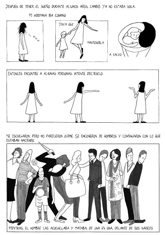 La narrativa compleja que propone la autora se funciona muy adecuadamente con secuencias que manejan todo tipo de técnicas gráficas. La novela que nos llevará a viajar por dibujos simples y por otros repletos de detalles. Por momentos, la línea definida en tinta negra se encarga de resaltar personajes estereotipados y con características físicas que apelan a un dibujo más infantil; por otros, la relación figura-fondo se vuelve super compleja y los dibujos encuentran su triste belleza en el detalle y en el uso de la mancha.