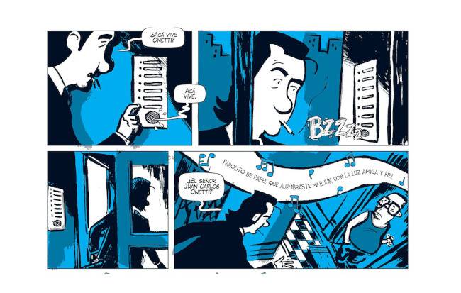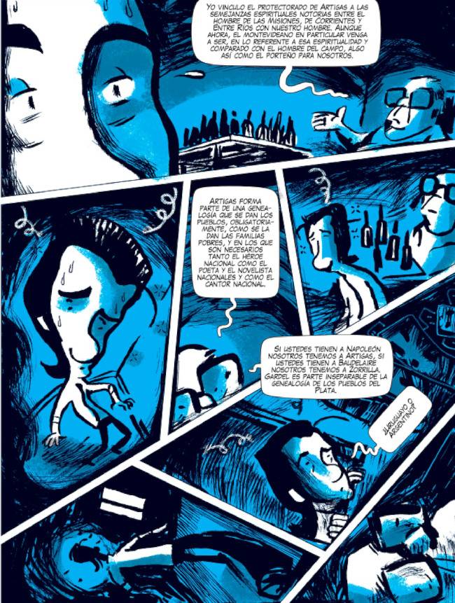 Los trazos gruesos de Aguirre le otorgan personalidad a lxs personajes, mientras la expresividad de su línea consigue transmitir tensiones y emociones. Entre todxs lxs personajes, cabe destacar particularmente a su protagonista, a quien Aguirre consigue retratar a partir de sus miradas, gestos y formas de agarrar la guitarra y caminar. La portada para la edición de 2025 del Fondo de Cultura Económica es una absoluta belleza, puesto que de manera indiscutida es Zitarrosa en toda su esencia: sus cejas, su concentración en los sonidos que salen de su guitarra, su pucho, prendido en su boca.