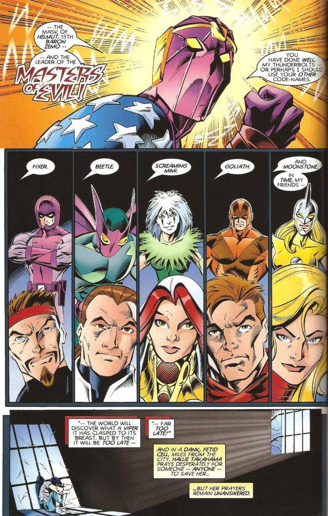 En aquella ocasión, Ciudadano V (Helmut Zemo) lideraba una formación de villanos compuesta por Atlas (Goliath), MACH-I (Beetle), Meteorite (Moonstone), Songbird (Screaming Mimi) y Techno (Fixer)