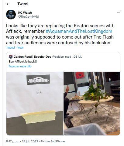 De acuerdo al usuario de Twitter KC Walsh, Warner estaría reemplazando las escenas que se habrían filmado con Michael Keaton con Ben Affleck, quizá como una forma de congraciarse con el grueso del público, que le está haciendo la cruz al estudio por no cumplir con sus pedidos.