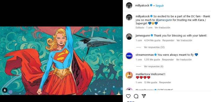 “Estoy muy emocionada de ser parte de la familia de DC. Muchas gracias James Gunn por confiar en mí tu Kara / Supergirl”, escribió ella en su cuenta de Instagram junto a una imagen de la heroína, mientras que el director le respondió: “Gracias por bendecirnos con tu talento”.
