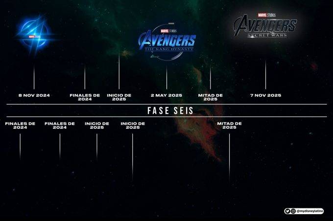 De esta manera, la versión cinéfila de la Casa de las ideas mostró dos esquemas con los films que ya tiene programados de acá a 2025, en las fases 5 y 6 del MCU, que incluyen dos películas de Avengers para 2025.