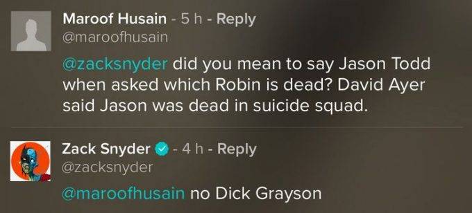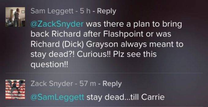Pero además surgieron nuevos detalles de la versión de la Liga de la Justicia, una de las cuales daba cuenta de la presentación en sociedad de Carrie Kelley, la Robin de The Dark Knight Returns. Esto viene de una pregunta que le hizo una de sus seguidores de la red social Vero, donde Snyder suele compartir muchísimo material. Con el dato (confirmado por el director) de que el traje del Robin muerto que apareció en Batman v Superman era el de Richard Grayson, el fan le preguntó si había algún plan para traer de vuelta al futuro Nightwing en la futura película de Flashpoint o se iba a quedar muerto en esa continuidad. “Se queda muerto…. Hasta Carrie”, fue la respuesta.