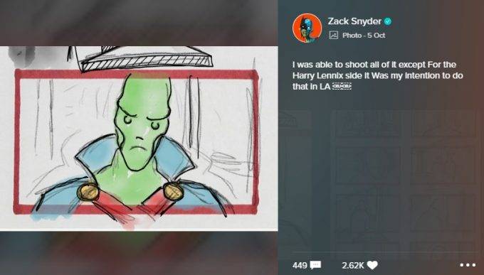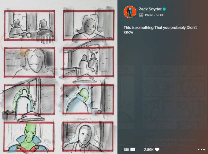 El director mostró un storyboard en el que se puede ver la escena en la que Martha Kent y Lois Lane comparten la mesa, y que deriva en la revelación de que la madre de Clark era nada menos que J´onn J´onzz, que también. Asimismo, el marciano también impersonó al general Calvin Swanwick, que aparecía tanto en Man of Steel (2013) como en Batman v Superman (2016) interpretado por Harry Lennix. Snyder explicó que la escena no se llegó a filmar porque Lennix estaba en Los Angeles y cuando planificaba mudar todo allí, se produjo su retiro.
