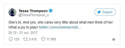 Lo cierto es que, como para no dejar dudas, la propia Thompson –que interpretó a la novia de Adonis Jonhson en Creed-, lo aclarón en un tuit. “Ella es bi(sexual) Y sí, a ella le importa muy poco lo que los hombres piensen de ella. Y es muy gratificante interpretarla”, escribió.