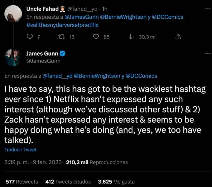 Por su parte, James Gunn se pronunció de manera divertida sobre el trending topic #SellTheSnyderverseToNetflix. «“Debo decir que este tiene que ser el hashtag más loco porque 1) Netflix no ha expresado tal interés (aunque hemos discutido otras cosas) y 2) Zack no ha expresado ningún interés y parece estar feliz de haciendo lo que está haciendo (y, sí, también hemos hablado)”, explicó en uno de sus infinitos comentarios en Twitter.