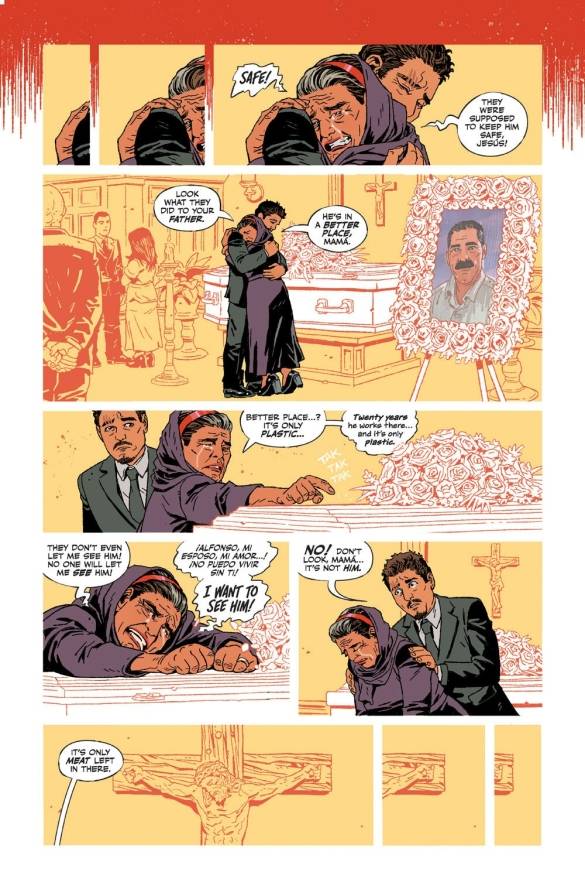 Por supuesto, este es uno de los mejores números desde lo narrativo, pero esto no desmerece para nada la labor de Zawadzki en cada uno de los capítulos anteriores. El número que comenté más arriba con el hombre que trabaja en un matadero y salta en el tiempo es una proeza desde la puesta de cada página, un delirio narrativo precioso que refuerza y valida la historieta como medio, el único lugar en el que se pueden contar historias de esta manera y que funcionen. El único.