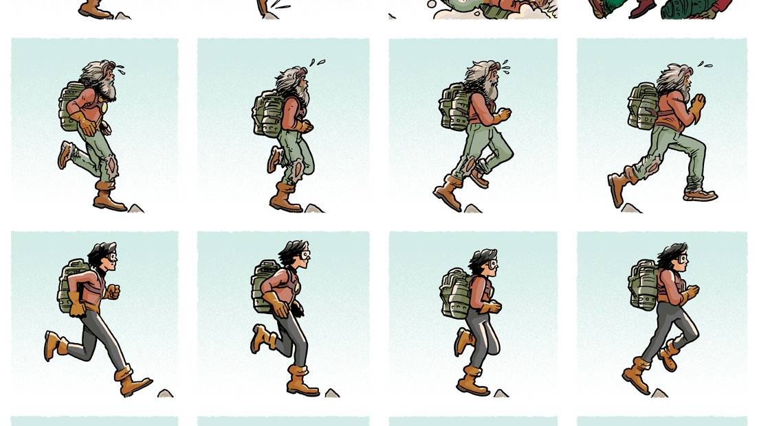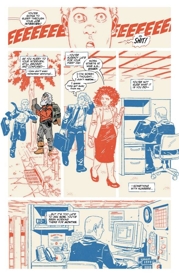 El cuarto número nos muestra una persona que experimenta el tiempo de forma lineal, sí, como todos nosotros, pero todo sucede muy rápido. En apenas unas horas pasa de niño a adolescente, ese mismo día más tarde ya egresó de la secundaria y está estudiando algo, antes de anochecer ya tiene su primer trabajo, y así. Tiene una cita con una mujer, y antes de que termine la misma ella ya está embarazada, por ejemplo, y durante ese día se da cuenta que es padre de dos niños, no uno. El protagonista es completamente consciente del paso del tiempo acelerado, no se alarma ni se aterra, lo toma con bastante tranquilidad, e incluso plantea algunas reflexiones que definitivamente yo no podría siquiera elaborar en una situación como esa. En algún punto, la historia nos ayuda a entender que tenemos que parar la pelota, a veces, y observar un poco lo que nos rodea, vivir el momento. Parece un consejo sacado de una frase motivacional berreta que nos cruzamos de casualidad en algún reel inocuo, pero el hilo narrativo está montado de manera muy inteligente y nos permite abrirnos a la reflexión.