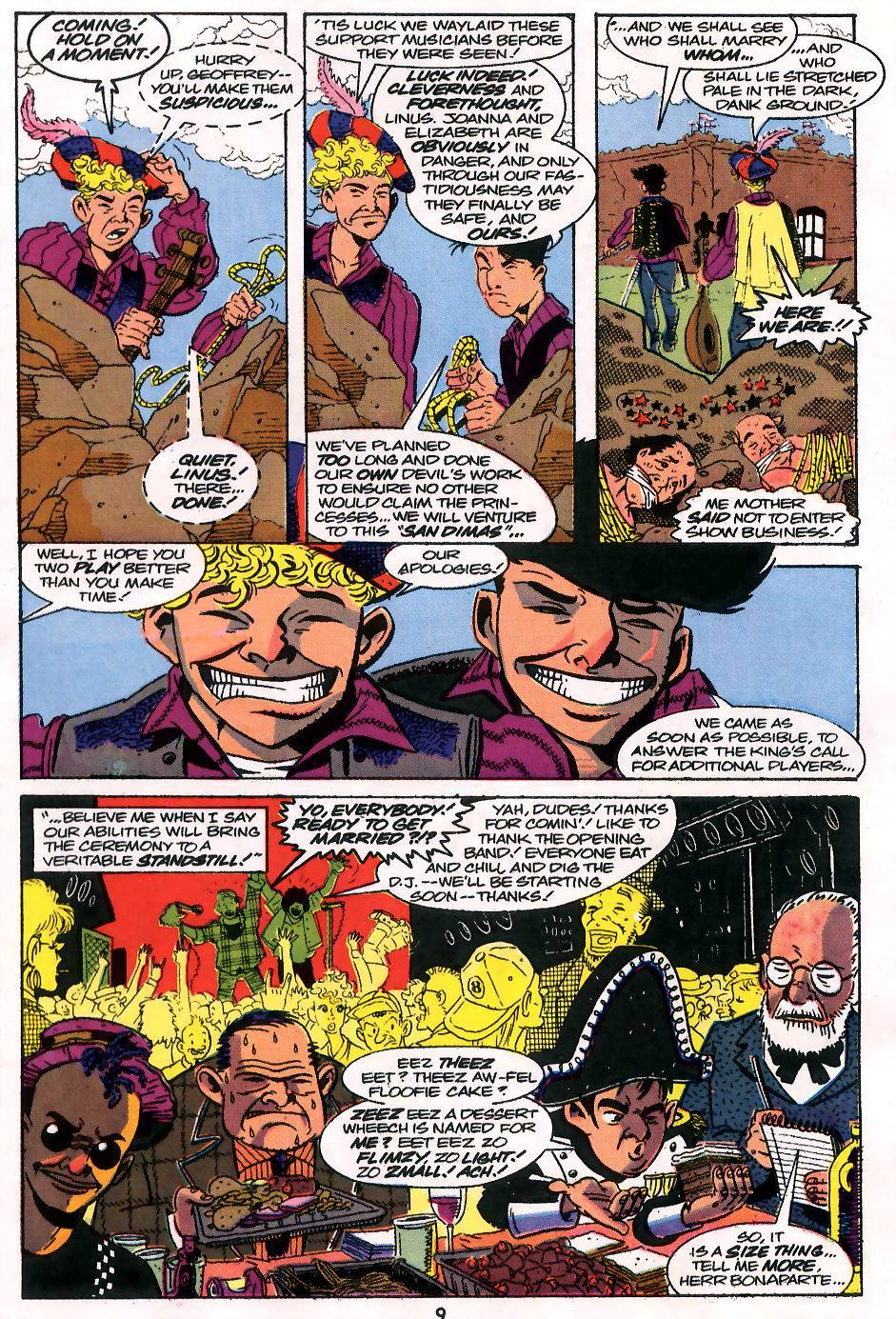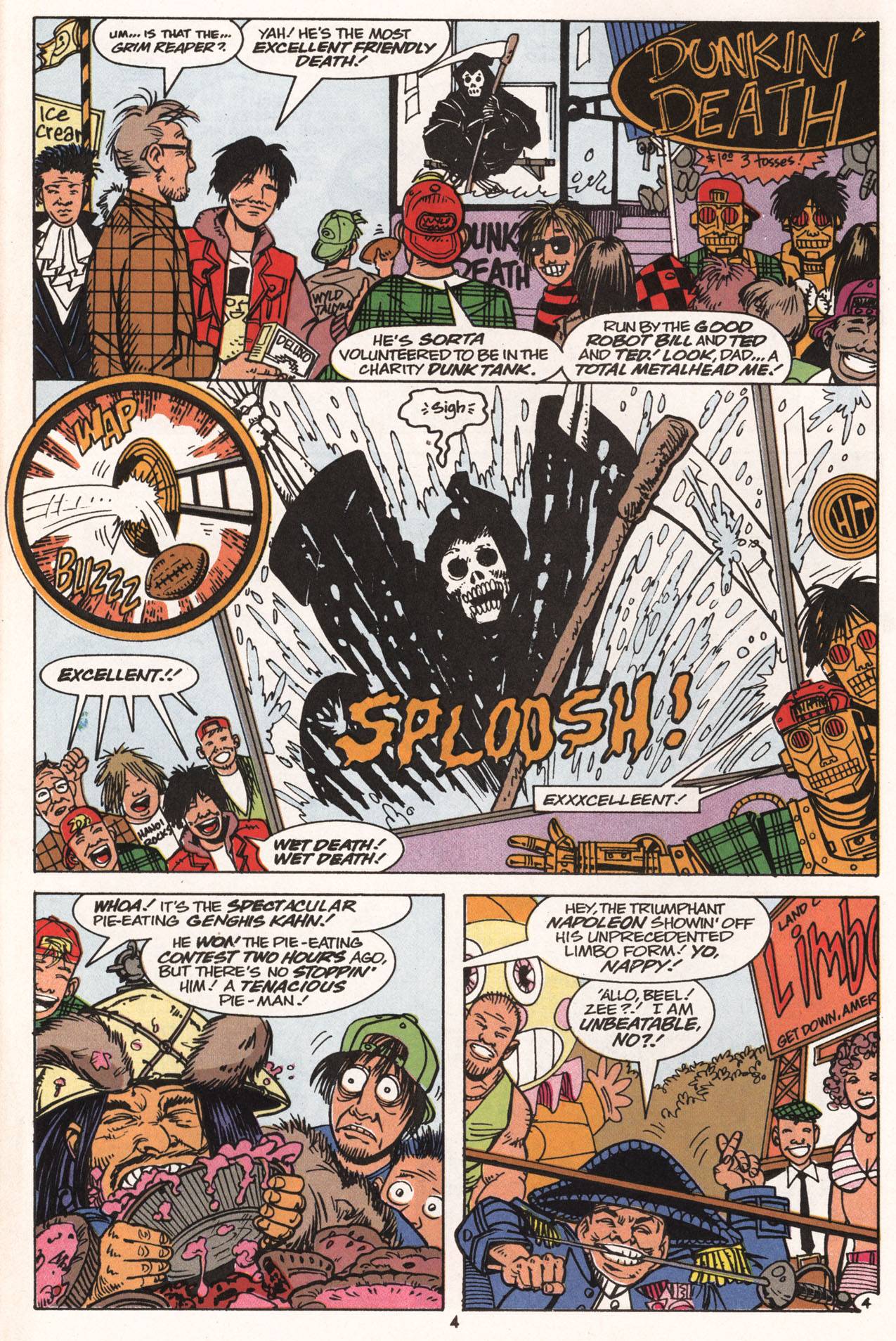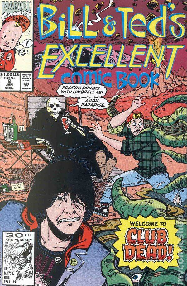 Evan Dorkin fue el encargado de realizar la adaptación al comic de la película “Bill & Ted’s Bogus Journey”, la segunda película de esos personajes, lanzada en 1991, co-protagonizada por Alex Winter y Keanu Reeves, quienes volvían a interpretar eneésta nueva oportunidad los papeles de Bill Preston y Ted Logan, respectivamente. Los hechos y personajes acontecidos en esta segunda película, adaptados en su respectivo comic, fueron el punto de partida para la serie de 12 números titulada “Bill & Ted Excellent Comic Book”, escrita y dibujada por Evan Dorkin (autor también entre otras cosas, de Milk & Cheese, de la que ya realicé una nota tiempo atrás en ésta misma sección), publicada entre Diciembre de 1991 y Noviembre de 1992.